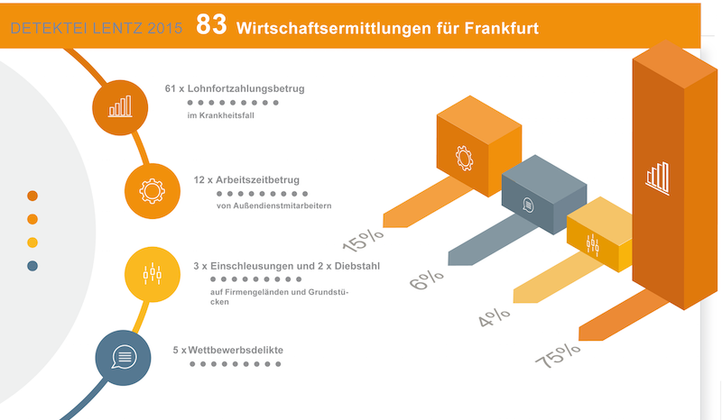 Gerade für Unternehmen und Gewerbetreibende ermittelt unsere Detektei Frankfurt hauptsächlich im Bereich Lohnfortzahlungsbetrug im Krankheitsfall. Allein im Jahr 2015 haben wir 61 Verdachtsfälle verzeichnet. Unsere Nachweisquote liegt hier bei 95%. Auch der Bereich Arbeitszeitbetrug ist immer wieder ein Thema. Hier haben wir 12 Verdachtsfälle mit einer Nachweisquote von 88%. Bei diesen Wirtschaftsermittlungen haben unsere Ermittler über die Jahre viel Erfahrung gesammelt.