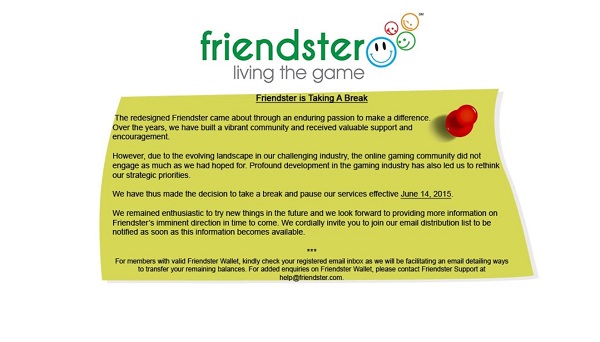 Friendster ging 2002 an den Start und zählte im Jahr 2011 mehr als 115 Millionen aktive Nutzer. Doch die Gaming-Komponente, die Friendster zur Differnzierung nutze, genügte auf Dauer nicht, um sich von Facebook abzugrenzen. Seit dem 14. Juni 2015 gibt es Friendster nicht mehr.
