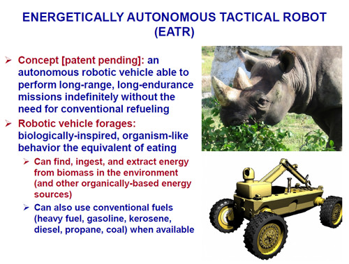 Dieser Roboter ist streng vegetarisch. […] RTIs patentiertes Robotersystem wird in der Lage sein, Energie in Form von Biomasse zu finden, aufzunehmen und zu extrahieren. Im Gegensatz zu anderslautenden Meldungen zählen „menschliche Körper“ nicht dazu. Die Öffentlichkeit kann versichert sein, dass der Motor, den Cyclone entwickelt hat, um den EATR mit Energie zu versorgen, auf Kraftstoffe zurückgreift, die nicht furchterregender sind als kleine Ästchen, Gräser und Holzsplitter – kleine, pflanzenbasierte Dinge, für die RTIs Robotertechnologie bei der Futtersuche ausgelegt ist.