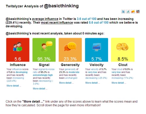 Wie man sieht, ist Basic Thinking nicht ganz schlecht unterwegs, aber natürlich ist noch mehr drin. Wie man am „More Detail“-Hinweis unter jeder „Maßeinheit“ erkennen kann, ist eine tiefergehende Analyse möglich, aber die erspar ich euch jetzt. Für diejenigen also, die gerne sehr genau wissen, wo sie wann womit wie viel Einfluss ausüben, für die ist dieser Dienst genau der Richtige, denke ich. Allerdings besteht bei der Nutzung immer die Gefahr, in Depressionen zu verfallen, wenn der „Erfolg“ sich nicht direkt proportional zur Tweets-Anzahl verhält.