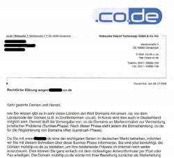 Die co.de-Geschichte hat hohe Wellen im Netz geschlagen. Zum Wochenende hatten unzählige Blogger einen Brief der Websuche Search Technology GmbH & Co. KG aus Osnabrück erhalten: „Rechtliche Klärung“ stand jedes Mal über dem Schreiben. Darin wurde das Angebot unterbreitet, sich eine Domain in Form von domainname.co.de zuzulegen, „in vielen anderen“ Ländern sei es ja bereits üblich. Der Preis betrage 99 Euro pro Jahr.