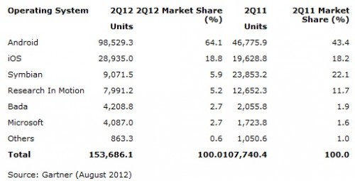 Nach IDC und Canalys hat heute auch Gartner neue Zahlen zum Markt für Mobiltelefone und Smartphones im 2. Quartal 2012 vorgelegt. Wenig Überraschendes auch aus London: Samsung führt den Markt für Handys an, Android hängt alle ab. Symbian und Blackberry verlieren. TCL verkauft mehr Mobilfunkgeräte als HTC, wenn auch hauptsächlich Feature Phones. Der Gesamtmarkt für Mobilfunkgeräte sinkt um 2,3 Prozent auf 419 Millionen Geräte. Smartphones allerdings legen mächtig zu: um 43 Prozent auf 154 Millionen Geräte.