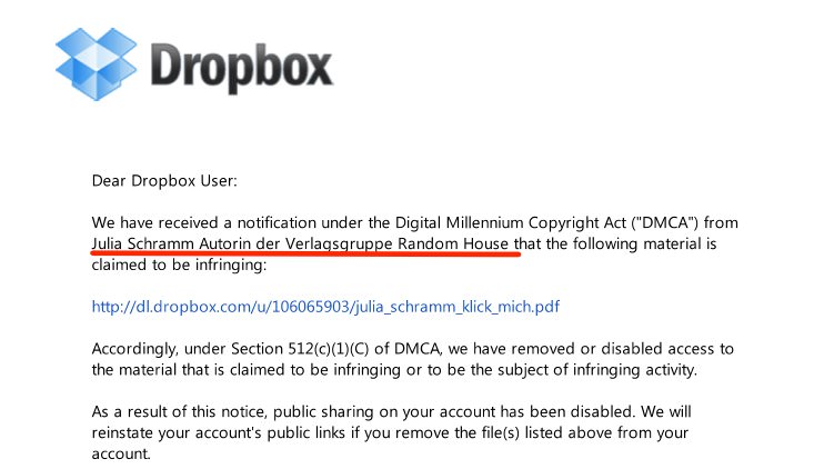 Gesagt getan. Das Buch erschien gestern auf einer Tumblr-Seite, die auf einen Dropbox-Link verweist. Noch am Abend schaltete sich der Verlag bei Dropbox ein und ließ es entfernen. Gemein natürlich, dass jetzt der Name der Autorin dort prankt, als hätte die Piratin das Buch selbst löschen lassen. Julia Schramm ist seit gestern in einer Zwickmühle. Sie verweist heute auf einen Link, warum Ebooks nicht kostenlos sein dürften und begrüßt ihre Twitter-Follower halb-ironisch mit den Worten „Guten Morgen, lieber Mob“. Morgen.