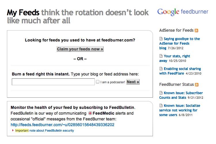 Schaut man sich die Startseite von Feedburner an, sieht man, dass Google seit der Übernahme im Juni 2007 nicht mehr viel an dem Dienst gemacht hat. Er wurde bis auf kleine Veränderungen und ein experimentelles Statistik-Tool auf seinem damaligen Stand belassen. Aus irgendeinem Grund wurde Feedburner in Googles Adsense-Werbesparte integriert, das Feedburner-Blog dazu angeblich mangels Interesses im Juli dieses Jahres eingestellt. Es könnte daran gelegen haben, dass der letzte Eintrag davor zwei Jahre alt war.