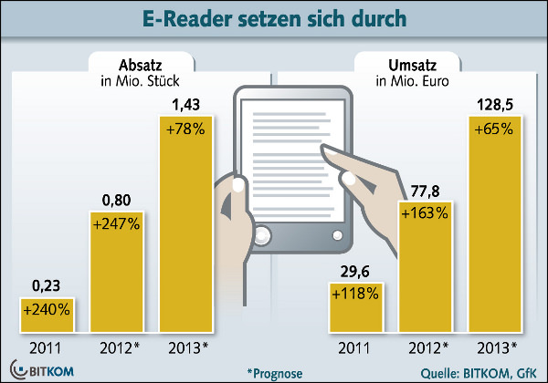Da laut einer GfK-Studie vom März zu Jahresbeginn 1,6 Millionen Menschen in Deutschland einen E-Book-Reader besaßen, werden es auf Grundlage der BITKOM-Zahlen Ende Dezember wohl um die 2,4 Millionen sein. Für 2013 prognostiziert der Verband zudem einen Anstieg beim Geräteabsatz auf insgesamt rund 1,4 Millionen Stück. Gleichzeitig soll der Umsatz von 78 Millionen Euro auf 129 Millionen steigen. Ein Durchbruch am Markt sei bei E-Books und E-Readern erkennbar, heißt es aus Berlin.