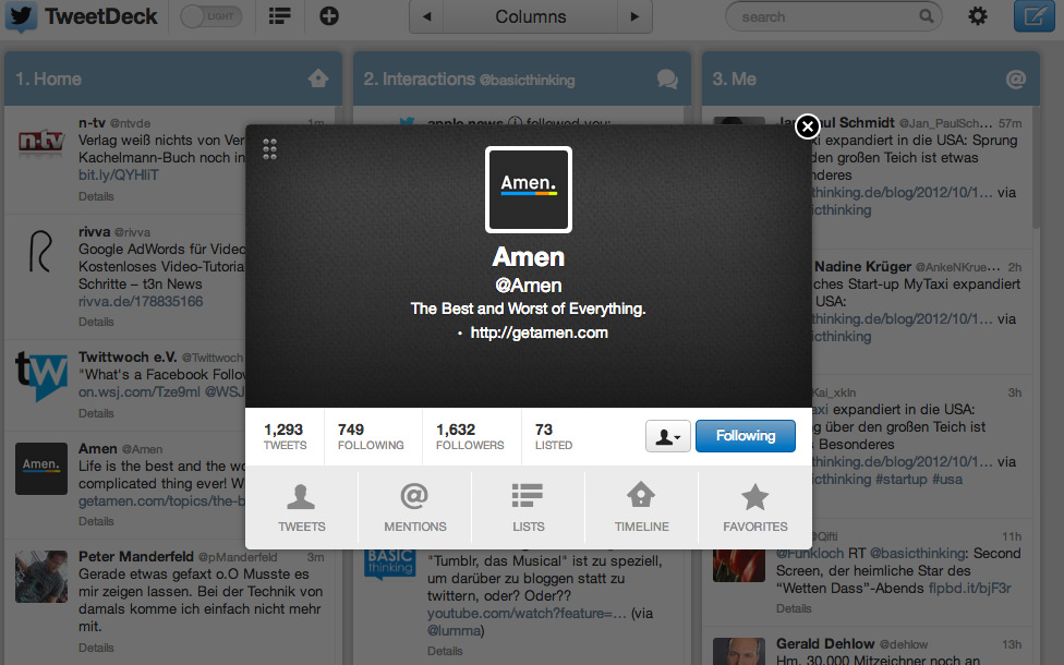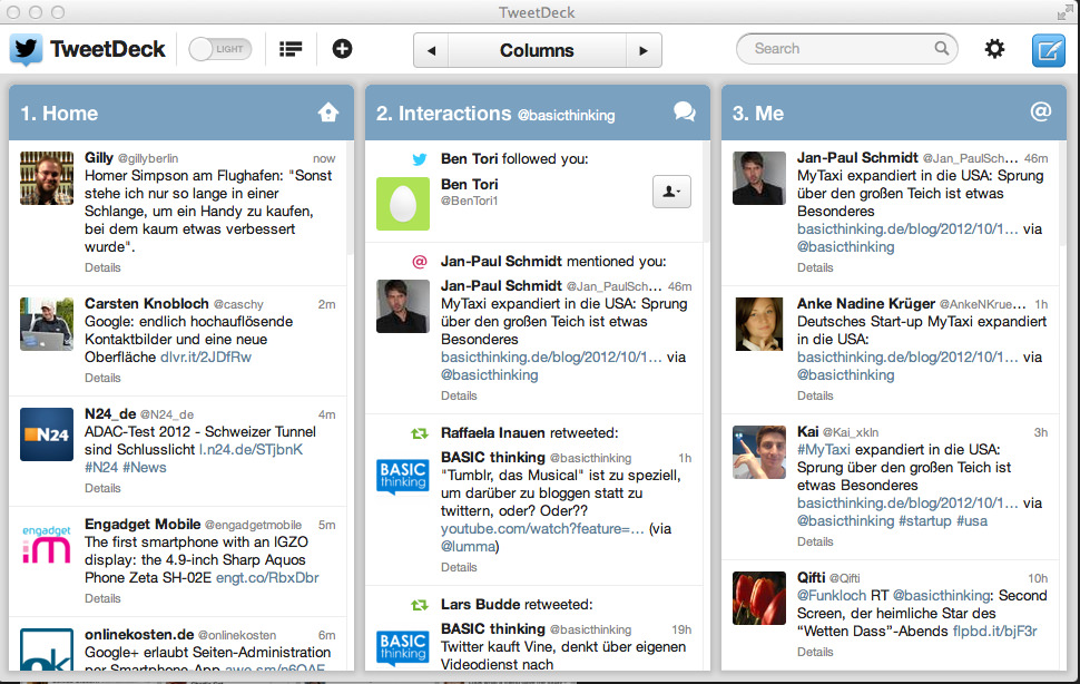 Alles in allem: Eine deutliche Verbesserung in der Bedienung, echte Schönheit und doch noch viele Fehlerchen. Es ist bemerkenswert, wie sehr Twitter mit der Anwendbarkeit seiner Apps zu kämpfen hat und dieses wichtige Kriterium der Augenfreundlichkeit komplett unterordnet. Dennoch: Bei Tweetdeck 2.0 scheinen diese Probleme nicht mehr so gravierend, wie etwa in Twitters offizieller iPhone-App, die ich nach einigen Wochen löschte, weil sie fast eine Minute lang für den Start benötigte. Es bewegt sich hier etwas in die richtige Richtung, wie leider nicht bei allem, was Twitter derzeit unternimmt.