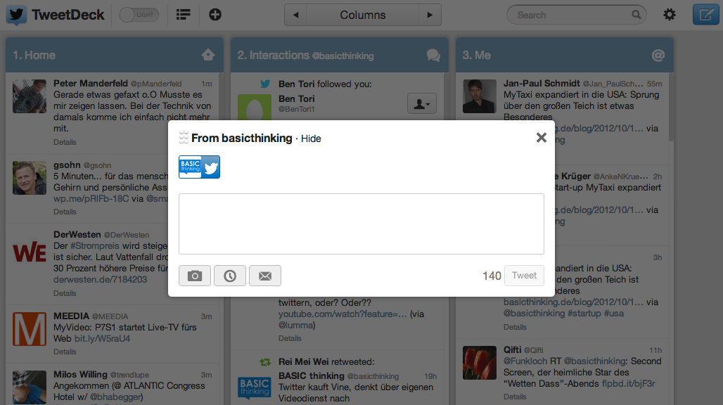 Ein paar Unstimmigkeiten bleiben natürlich. Für mich ist nach wie vor nicht nachvollziehbar, warum man einen eigenen Tweetdeck-Account benötigt, um die Software benutzen zu können. Das war nicht einmal notwendig, als Tweetdeck noch eigenständig war. Sich einfach mit seinem Twitter-Account einzuloggen, geht nicht mehr. Auch das Verfassen von Tweets scheint irgendwie zur Nebensache geworden zu sein. Wie schon in der Vorversion poppt erst beim Klick auf ein kleines Icon ein Layer auf, in dem man einen neuen Tweet oder eine neue Nachricht verfassen kann. In der Adobe-Air-Version gab es dafür einen festen Bereich im Hauptfenster. In der alten nativen Tweetdeck-Version war die Schaltfläche noch mittig in der Menüleiste platziert, jetzt ist sie nach ganz weit rechts an den Rand gerückt. Selber schreiben? Aus Twitters Sicht offenbar völlig überbewertet.
