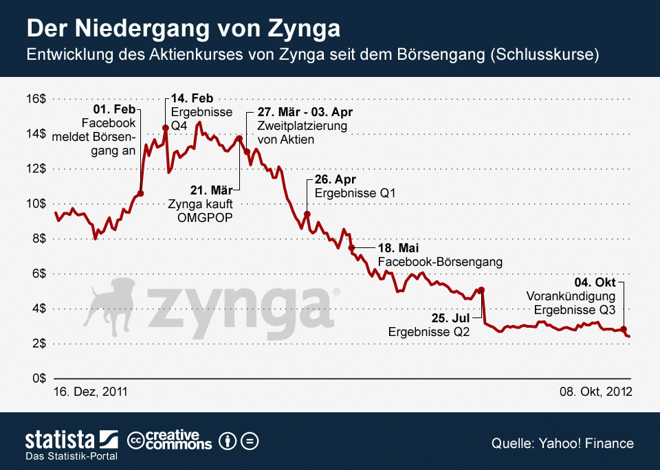 Bei Zynga ist es genauso wie bei digg. Beiden hatten ihre Hochzeit, aber beide haben ihr Konzept nicht weiterentwickelt. Dadurch wurden sie, die mal Stars des Internet waren, zu Steinzeitunternehmen des Internets. Bei beiden haben die Eigentümer versäumt, rechtzeitig Kasse zu machen um ihre Gewinne einzufahren. Das ist facebook nicht passiert. Der Zuckerberg hat rechtzeitig Kasse gemacht. So gesehen ist Zynga ein Beispiel dafür, wie man es nicht machen sollte.