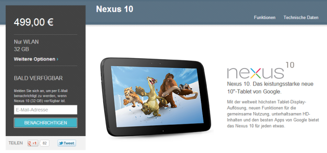 Ebenfalls ab dem 13. November soll das neue Nexus 10 in Deutschland erhältlich sein. Das 10 Zoll Tablet aus dem Hause Google bietet auf den ersten Blick Hausmannskost. Es kommt mit einem Dualcore, statt der leistungsstärkeren Quadcore-Boliden aus dem gleichen Hause. Auch preislich liegt es nicht unterhalb anderer Vertreter dieser Geräteklasse. 399 EUR werden für das 16 GB Modell, 499 EUR für das 32 GB Modell fällig.