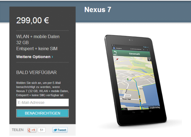 Für 249 EUR erhält man ab sofort, Google kündigt eine Lieferzeit von drei bis fünf Werktagen an, ein Nexus 7 mit 32 GB Speicherplatz. Entgegen der Ankündigungen zum Start des Nexus 7 legt Google nun zusätzlich eine Variante mit UMTS vor, so dass der vollständigen mobilen Nutzung ohne etwaiges Tethering nichts mehr im Wege steht.