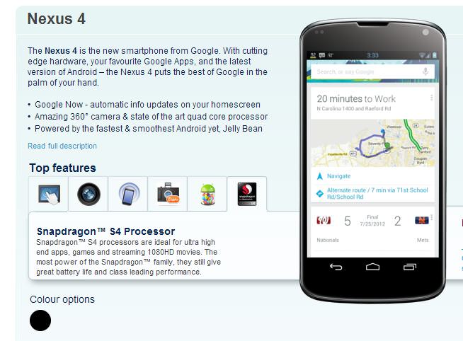 Demnach verfügt das Nexus 4 über einen Quad-Core-Prozessor Qualcomm Snapdragon S4 Pro mit 1,5 Gigahertz, 2 Gigabyte RAM, einen 4,7 Zoll großen LCD-Touchscreen (1.280×768 Pixel; 320 PPI), eine 8-Megapixel-Hauptkamera mit Autofokus und Videoaufnahme in 1.080p-Qualität (30 fps), eine Frontkamera, WiFi, UMTS mit HSPA, GPS, Bluetooth, Micro-USB und NFC.