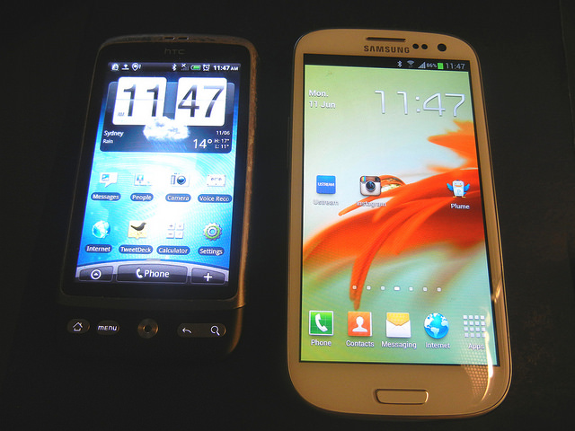 Die meisten dieser Smartphones, so unterschiedlich sie auch sein mögen, haben im Vergleich zu ihren direkten oder indirekten Vorgängern zumindest eines gemeinsam: sie werden (verdammt nochmal) immer größer. Beispiel Samsung Galaxy S: Während das Galaxy S noch ein handlicher 4-Zöller war, brachte es das S II bereits auf 4,3 Zoll. Dieses wiederum wirkt geradezu putzig gegen das aktuelle S III mit seinen monströsen 4,8 Zoll. Aber auch hier ist noch nicht Schluss: das S IV soll laut der südkoreanischen Website asiae.co.kr (Google Übersetzer einschalten!) angeblich sogar auf 5 Zoll wachsen. Oder das Google Nexus: Hier waren die ersten Modelle Nexus One (HTC) und Nexus S (Samsung) mit 3,7 und 4 Zoll noch recht Hosentaschen-freundlich, Galaxy Nexus (Samsung) und Nexus 4 (LG) sind mit 4,7 respektive 4,8 Zoll hingegen selbst für ein weit geschnittenes Beinkleid eher untauglich. Und auch der Großteil aller übrigen Modelle meiner obigen Aufzählung hat gegenüber ähnlichen Geräten früherer Jahrgänge teils ordentlich zugelegt.