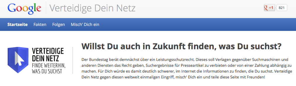 Google hat sich am Dienstagmorgen in die Diskussion um eine geplante Gesetzesänderung zum Leistungsschutzrecht eingeschaltet und versucht seitdem Nutzer über die eigene Homepage gegen das Gesetz zu mobilisieren. Auf der Startseite der Suchmaschine wird mit den Worten „Willst Du auch in Zukunft finden, was Du suchst? Mach‘ mit: Verteidige Dein Netz“ auf eine eigens angelegte Kampagnenseite verlinkt.