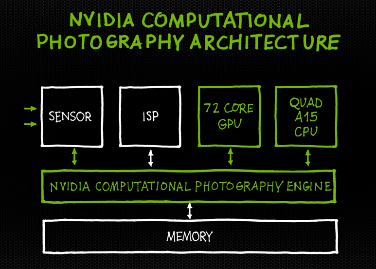 Als „Durchbruch“ will Nvidia zudem die Foto-Eigenschaften des Tegra 4 durch eine neuartige Chiparchitektur („Computational photography architecture“) verstanden wissen. Diese soll eine beschleunigte Aufnahme und Verarbeitung von HDR-Bildern – also Hochkontrastaufnahmen – durch ein intelligentes Zusammenspiel von CPU, GPU und Bildsignalprozessor ermöglichen. Die Geschwindigkeit der Bildaufnahme könne mit dem Tegra 4 um das Zehnfache gesteigert werden, heißt es.