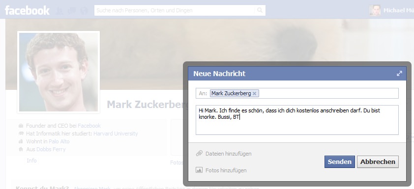 Bei einem Selbsttest mit einer Nachricht an Herrn Zuckerberg zeigte sich mir jedenfalls keine 100-Dollar-Option. Ob dies nun daran liegt, dass ich in Deutschland zuhause bin oder sich Mark so wenig für all das, was mir auf dem Herzen liegt interessiert, dass der Spamordner für digitale Briefe von mir in jedem Fall die richtige Wahl ist… ich weiß es nicht. Mir auch egal. Denn ich vertraue Facebook. Heißt es doch auf der Startseite: Facebook ist und bleibt kostenlos. Gott. Sei. Dank!