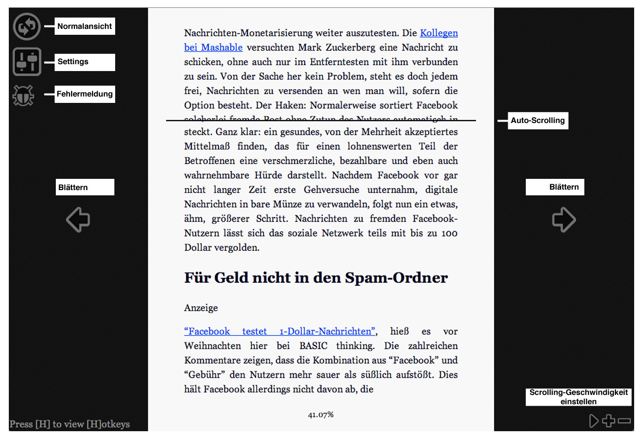 Ein Add-on für Googles Webbrowser Chrome könnte meine Konzentration jetzt zu kanalisieren helfen: MagicScroll. Die Erweiterung vermag die Ansicht einer Website in die eines E-Books zu verwandeln. Der Vorteil: Das zuweilen doch recht üppige Drumherum auf einer Homepage fällt bei dieser Optik, vermutlich sehr zum Ärger der Werbetreibenden, komplett weg. Zudem navigieren wir nicht mehr vertikal durch einen Artikel, sondern blättern seitenweise vor oder eben zurück, ganz so, wie es auch bei E-Books üblich ist. Richard Wallis, Chef-Entwickler von MagicScroll, nennt gegenüber thenextweb.com dann auch das klassische Scrollen auf Websites als Hauptgrund für die nachlassende Konzentration. „Das ständige Scrollen, auch wenn es ihrer Kontrolle unterliegt, unterbricht den Leserythmus.“