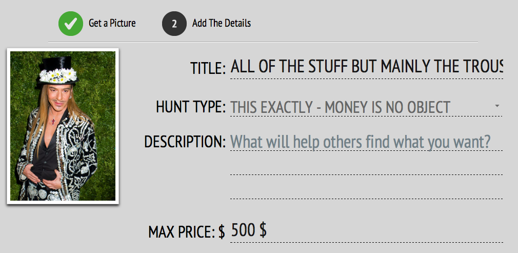 Der User trägt nach dem Upload über ein einfaches Interface die erwünschten Optionen ein, ob er z.B. nur die Schuhe oder auch die Hose, den Kopfschmuck oder den Ohrring finden möchte und gibt, bevor er seine Suche zur Jagd freigibt, noch Auskunft über den Preis, den er zu zahlen bereit ist. Fertig. Im Idealfall begibt sich die Community anschließend schwarmweise auf die Suche und wird in den zahlreichen Web-Stores fündig. In diesem Fall wird der Suchende sogleich informiert.