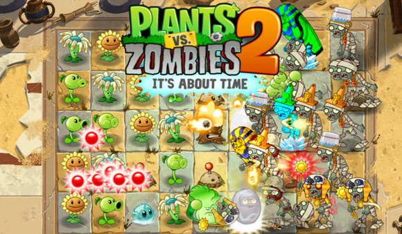 Schuster, bleib bei deinen Leisten: Getreu diesem Motto hat Entwickler PopCap das grundlegende Spielprinzip von „Plants vs Zombies 2“ nicht großartig verändert. Man pflanzt witzig gestaltetes Grünzeug wie Erbsen-Kanonen, Maiskolben-Schleudern und prügelnde Kohlrabi, um damit heranschlurfende Untote zu stoppen. Dieses Mal erledigt man das in drei verschiedenen Zeitzonen (Altes Ägypten, Piraten-Welt und Wilder Westen), wo einem zusätzlich noch Blitz-Attacken, Dünger und ähnliche Goodies zur Verfügung stehen.