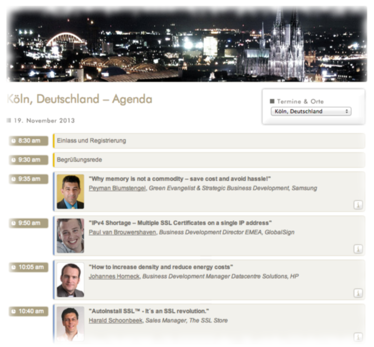 Diese beinhalten den Eintritt zur begleitenden Messe hosting.FAIR und zu sämtlichen Kurzvorträgen rund um aktuelle Hosting-Themen. Ebenfalls inklusive sind dabei ein Mittagessen und die Kaffeepausen. Um kostenlos teilzunehmen, genügt die Anmeldung über unseren Registrierungslink und den darin enthaltenen Ticket-Code. Als Redner haben die Veranstalter bekannte Vertreter ihrer Zunft geladen, darunter Referenten von Samsung, GlobalSign und HP. Die vollständige Agenda ist online abrufbar, Konferenzsprache ist Englisch.