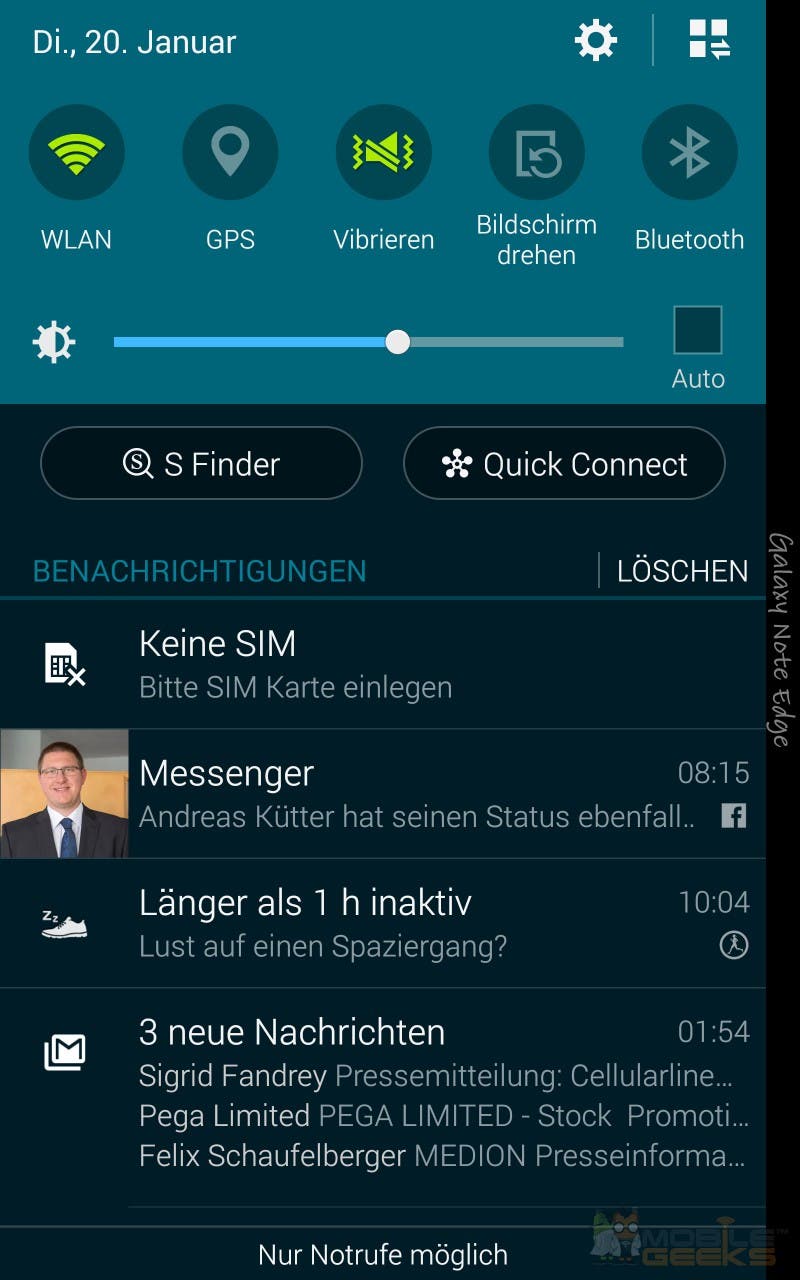 Schnell gewöhnte ich mir daher an, meinen Daumen bzw. den Handballen möglichst vom rechten Rand des Displays fernzuhalten, doch dies sorgt eben auch dafür, dass man andauernd die zweite Hand zu Hilfe nimmt. Außerdem greift man das Gerät nicht mehr so selbstbewusst wie beim Note 4, was das Risiko eines Sturzes freilich steigert. Neben den diversen Nachteilen, die sich zumindest beim großen Note Edge durch das gewölbte Display ergeben, gibt es natürlich auch einige gute Dinge darüber zu sagen.