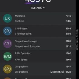 In den meisten anderen Punkten unterscheidet sich das Samsung Galaxy Note Edge natürlich kaum vom Schwestermodell Galaxy Note 4. Das Gerät besitzt den gleichen Qualcomm Snapdragon 805 Quadcore-SoC mit vier bis zu 2,7 Gigahertz schnellen Kernen, der Arbeitsspeicher ist gleich groß und die Maße des in Benchmarks genutzten Bereichs des Displays sind ebenfalls identisch. Dementsprechend gelten die gleichen guten Ergebnisse aus den Tests mit dem Note 4. So werden in AnTuTu locker Werte jenseits der 48.000-Punkte-Marke erzielt und in 3DMark absolviert das Note Edge den Unlimited-Test mit der erwartungsgemäß hohen Zahl von fast 20.000 Gummipunkten. Damit setzte sich das Gerät sogar noch vor das Note 4 und das Meizu MX4, das ausgerechnet mit dem Samsung-eigenen Exynos-Octacore daherkommt.