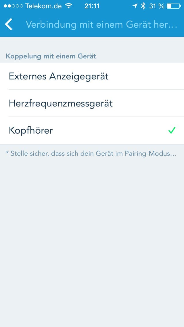 Wenn man den Kopfhörer das erste Mal verwenden möchte muss man (trotz der vollmundigen Aussage “Works with leading fitness apps“) zunächst auf die App Runkeeper zurückgreifen, weitere Apps wie Endomondo, Strava oder MapMyFitness sollen aber zeitnah folgen. Kopfhörer einstecken, Schalter auf Pulsmessung, App starten und unter Einstellungen -> Apps, Services und Geräte -> Geräte & Hardware den Punkt „Kopfhörer“ auswählen, nach ca. 10 Sekunden sollte euch das Herzsymbol am rechten oberen Rand zeigen, dass die Pulsmessung aktiv ist.