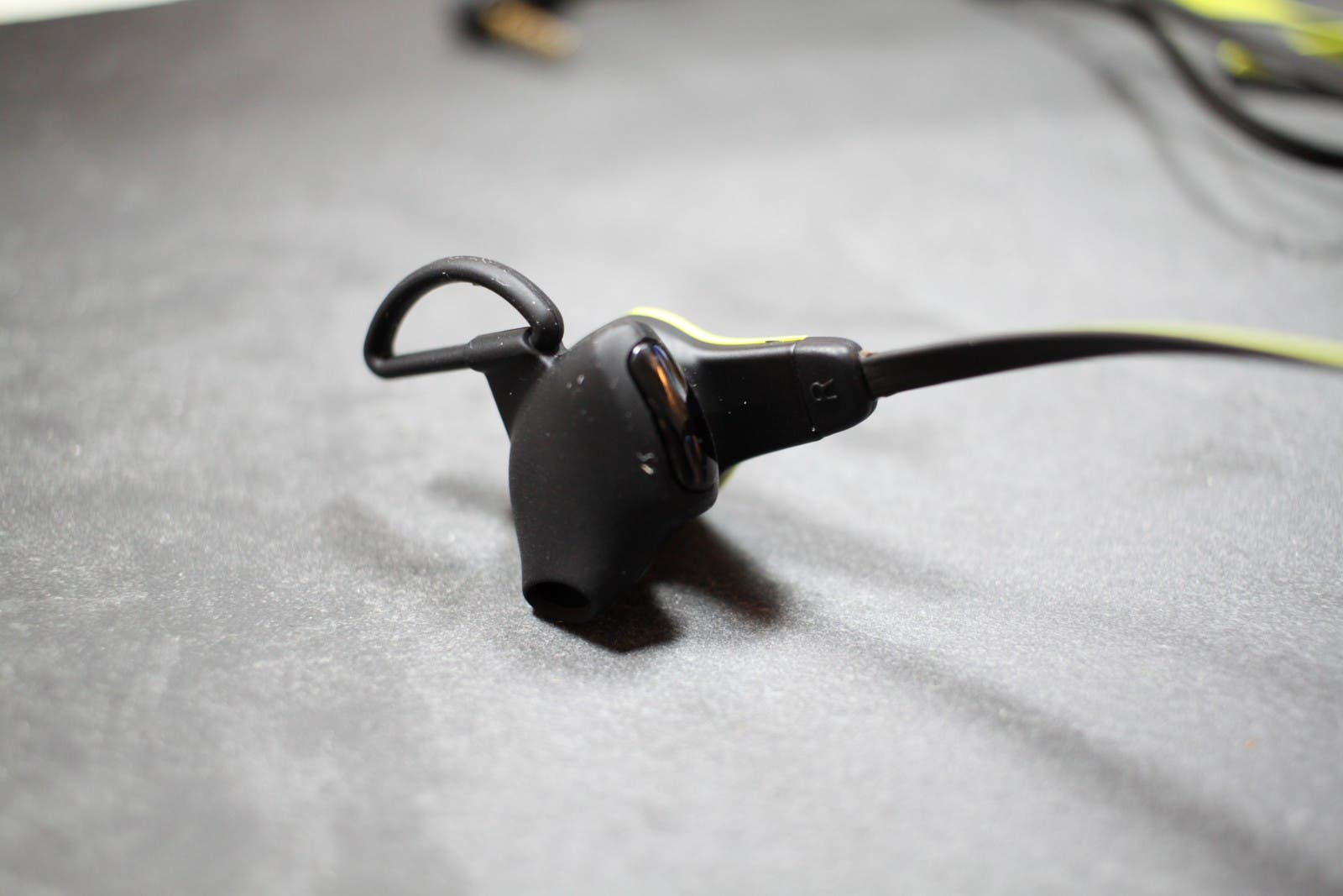Der Kopfhörer ist aus Kunststoff und Gummi gefertigt und ist meiner Meinung nach gut verarbeitet. Ca. 10 cm unterhalb des rechten Ohrhörers findet man eine Fernbedienung mit einem kleinen Schalter, hier lässt sich zwischen der Freisprechfunktion und der Pulsmessung umschalten, ein gemeinsames verwenden beider Funktionen ist daher leider nicht möglich. Die Gesamtlänge des Kopfhörers beträgt 125cm, was auch größeren Sportlern ermöglicht das Smartphone in an der Hüfte oder in der Hosentasche zu tragen. Die verwendeten Flachkabel verhindern zudem ein verheddern, wenn man den Kopfhörer lose in der Tasche trägt. Ein abgewinkelter 3,5 mm Klinkenstecker rundet das ganze ab.