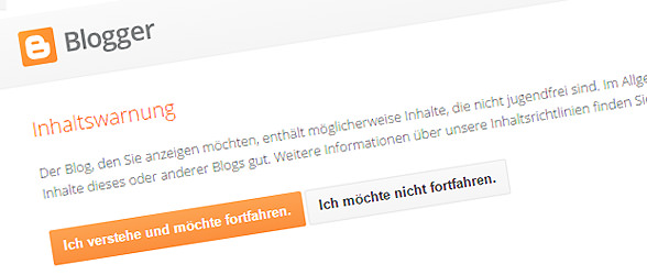 Das heißt: Wer künstlerisch wertvolle oder private Nacktfotos- sowie -Videos bei Blogger.com einstellen will, kann das weiterhin wie bekannt tun. Unter der Voraussetzung, dass man den Blog als „nicht jugendfrei“ markiert. Solchen Seiten wird ein Warnhinweis vorgeschaltet.