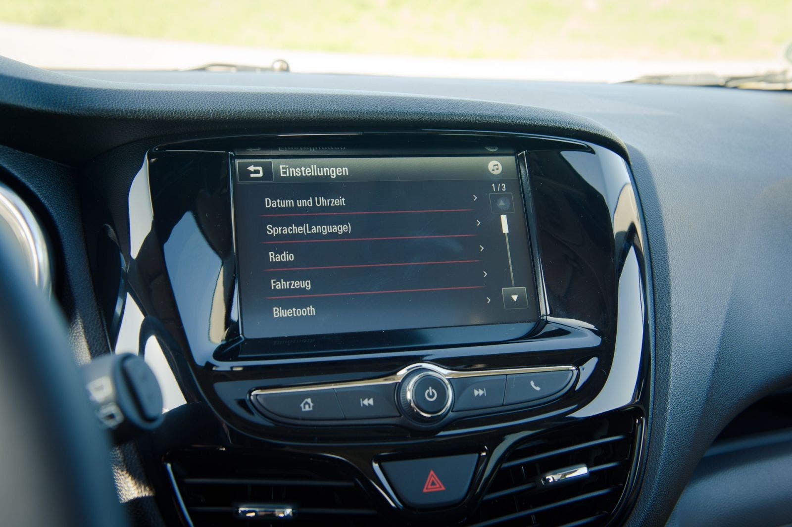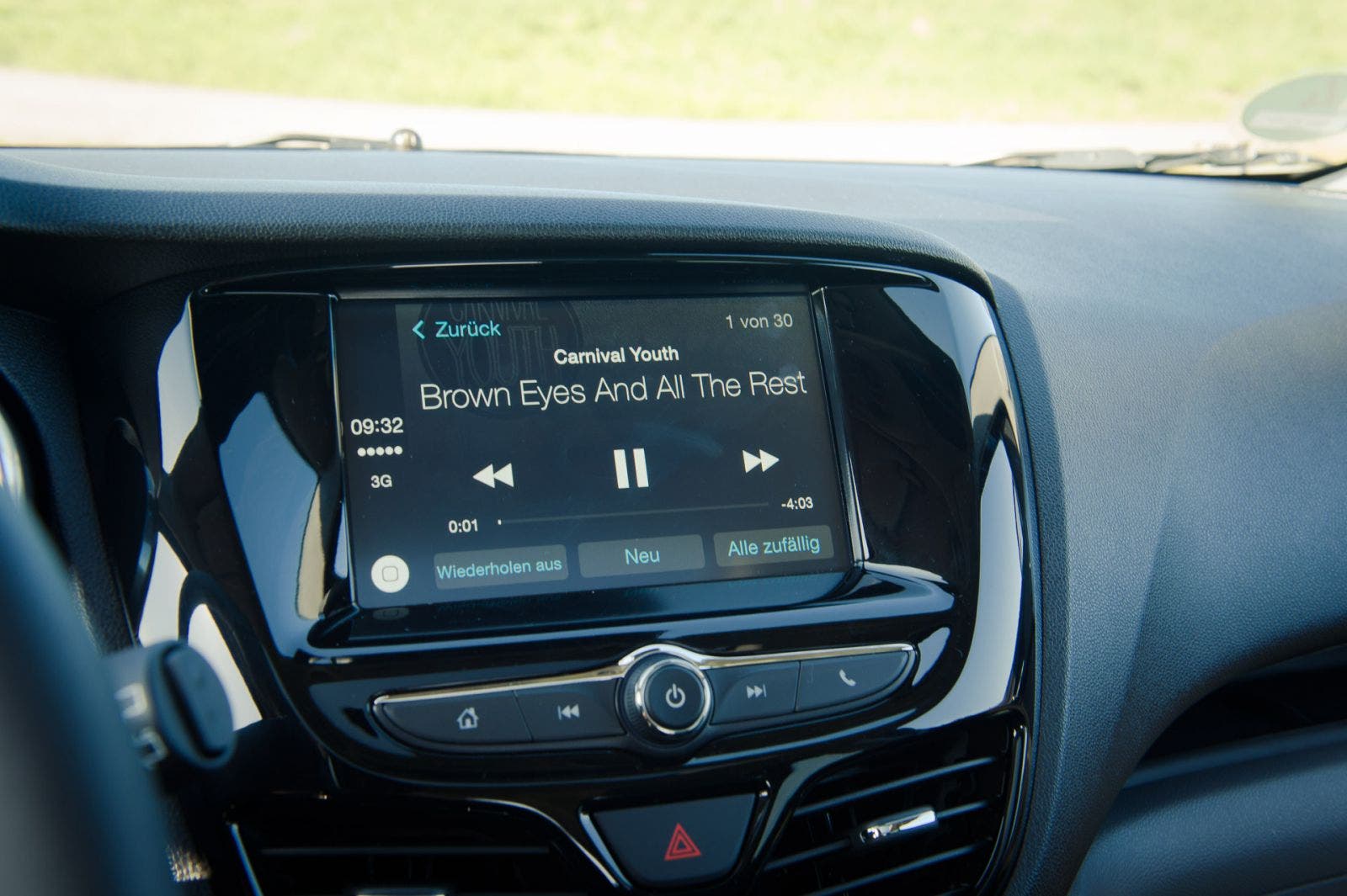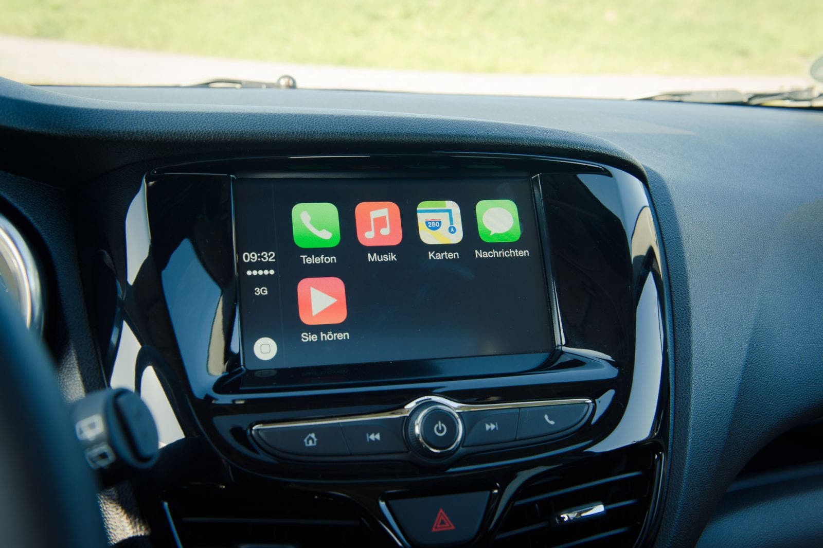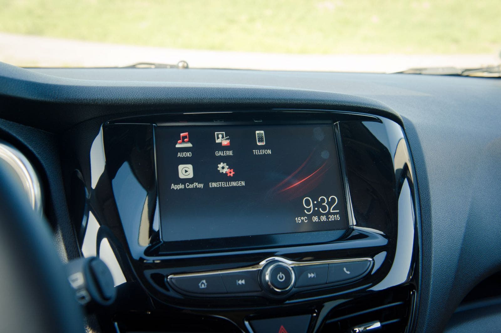 Beim Infotainment-System machen wir es uns mal ganz einfach. Nehmen wir mal ein handelsübliches Radio-Modul. Ach komm, DAB+ legen wir optional noch mit drauf. Und das flanschen wir dann an ein großzügiges 7″ Touchdisplay, was leider etwas zu kontrastarm geraten und bei Sonneneinfall auch nicht optimal abzulesen ist. Und weil die potentielle Zielgruppe doch eh ein Smartphone hat, soll das doch auch den Rest erledigen. Da schaffen wir fix die IntelliLink-Schnittstelle und können in die Broschüre auch noch Apple CarPlay und Google Auto schreiben. Gesagt getan. Und dumm ist das auch wirklich nicht. Das System wird aber erst Anfang 2016 verfügbar sein, die ersten verkauften Karls müssen ohne auskommen und die Offiziellen haben mir auch nicht gerade große Hoffnung gemacht, dass man es später nachrüsten kann.