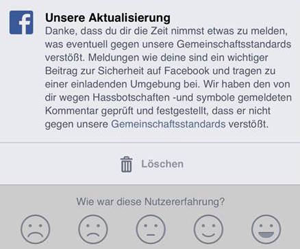 Wer diese Posts in Vielzahl meldet, kann am Ende sogar selbst mit Konsequenzen rechnen. Facebook verwarnt nämlich solche Nutzer irgendwann, wenn zu viele gemeldete Posts „nicht gegen die Gemeinschaftsstandards von Facebook“ verstoßen. Damit wolle man verhindern, dass das ungerechtfertigte Melde-Aufkommen im Rahmen bleibt. Etwa gab es Fälle von Medienunternehmen, die von PEGIDA-Anhängern in Reihe gemeldet wurden, nur weil denen die Berichterstattung der „Lügenpresse“ nicht passte.