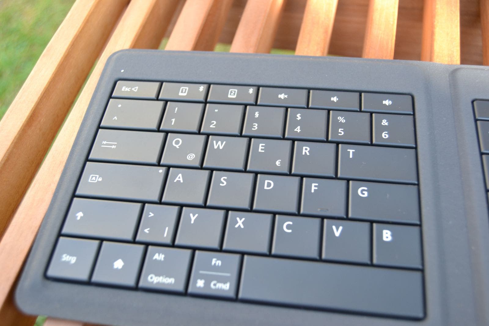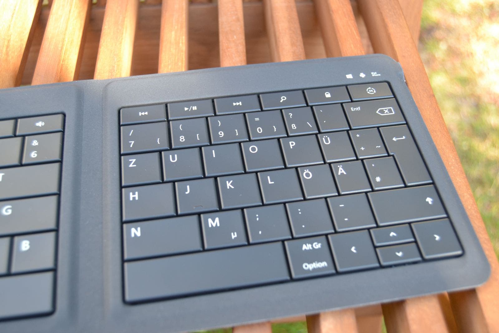 Der Knick ist so platziert, dass er beim Schreiben mit 10 Fingern nicht weiter stört. Einzig bei dunkler Umgebung ist es etwas schwierig zu tippen, wenn man sich noch nicht richtig an das Design gewöhnt hat. Eine Hintergrundbeleuchtung hat Microsoft leider nicht verbaut. Schade eigentlich, denn das habe ich an den Type Covern beim Surface sehr gern gesehen.