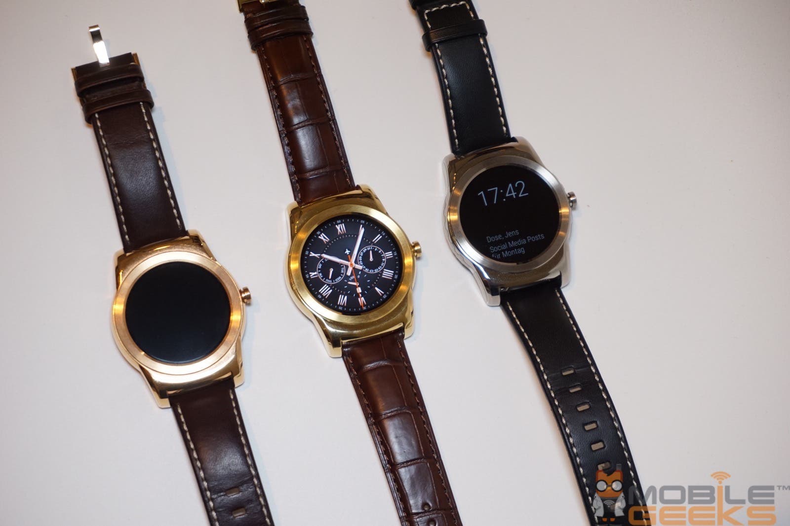 Update (3.9.2015): Kurz vor der IFA hatte LG die LG Watch Urbane Lux mit 24 Karat Gold Gehäuse vorgestellt und nun hatten wir eine Gelegenheit die Uhr ausführlich auszupacken und mit der normalen Urbane zu vergleichen. Das 24K Gold ist etwas heller als das eher kupferne Gold der „Standard-Urbane“ und sieht natürlich extrem edel aus. Auch die Schließe hat sich zu einer Doppelschließe verändert und besteht natürlich ebenfalls aus Gold. Das Armband ist deutlich weicher und ist aus Krokodilleder gestaltet, was einen weiteren hochwertigen Touch gibt. Exklusiv ist neben der Holzverpackung natürlich auch der Preis: 1200 US Dollar dürft ihr für die LG Watch Urbane Luxe auf den Tisch legen, wenn ihr eine der 500 handgefertigten Uhren ergattern wollt.