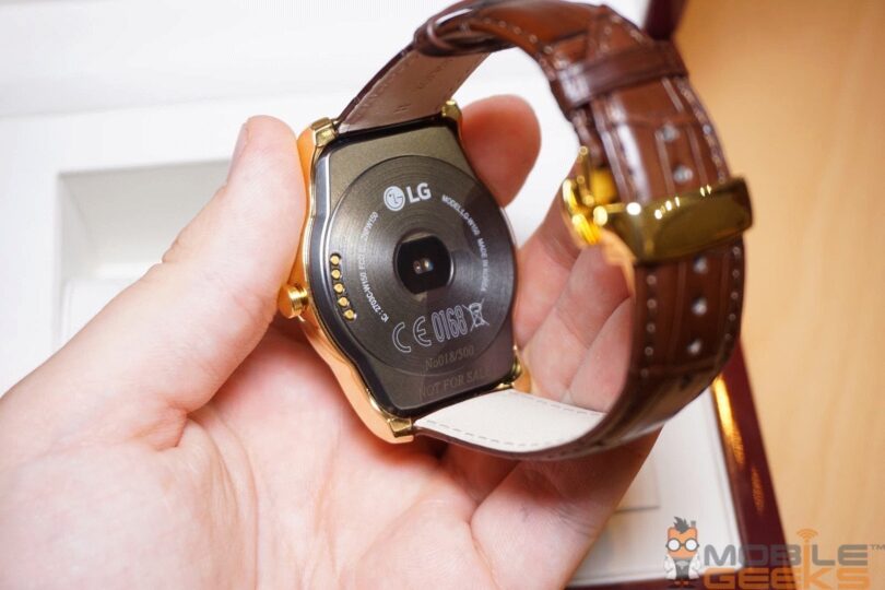 Auch ist die Größe mit der LG G Watch R fast identisch, die beiden Uhren haben allerdings ein deutlich unterschiedliches Design – somit sieht mal die eine größer aus, mal die andere, je nach dem wie das Licht gerade auf die Uhr fällt. Das abgerundete und polierte Design passt jedoch gut zum Gold, das die Vorderseite des Uhrengehäuses schmückt. Die Rückseite besteht wieder aus Kunststoff und beinhaltet in der Mitte einen Herzfrequenzsensor. Wie die LG G Watch R ist die Urbane wasserdicht (IP67) und zwar bis zu einer halben Stunde bei maximal einem Meter Tiefe. Damit könnt ihr sie beim Händewaschen oder Duschen ohne Sorgen anbehalten, vor dem Schwimmen solltet ihr sie allerdings lieber ablegen. Auf eine Uhr mit Lederarmband würde ich beim Schwimmen aber generell lieber verzichten – das Leder wird dadurch nicht gerade besser.