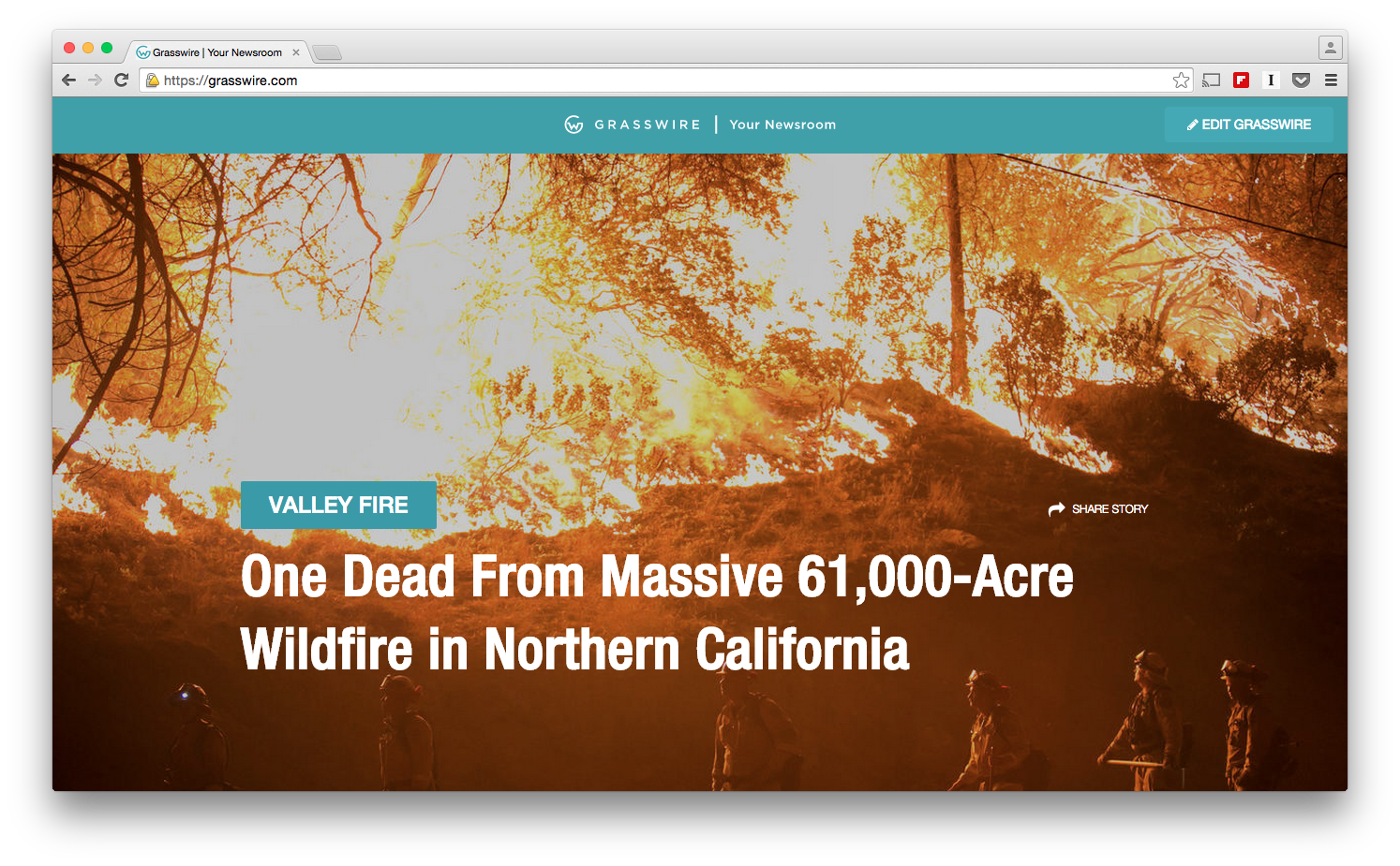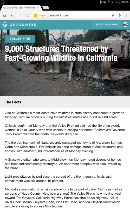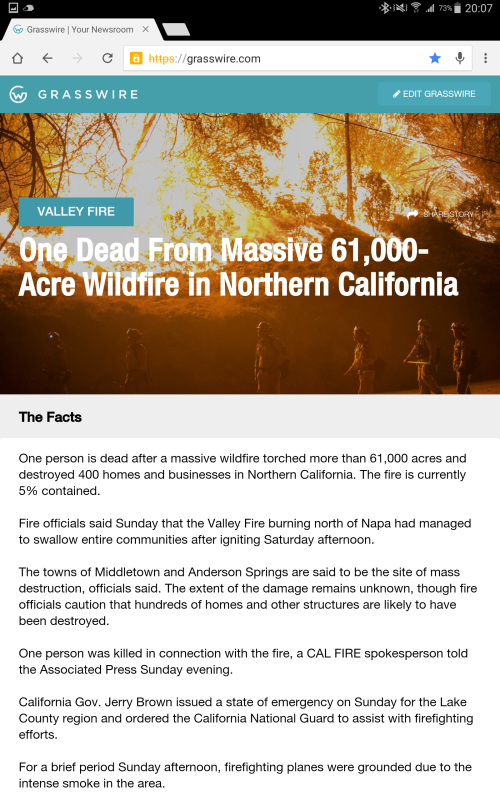 Der erste Eindruck von Grasswire ist noch relativ bescheiden. Das Layout ist nicht wirklich benutzerfreundlich, ich werde zunächst erschlagen von einem überdimensionierten Artikelbild inklusive Überschrift, das das komplette Fenster einnimmt. Es ist ein schaurig-schönes Bild vom zerstörerischen Feuer in Kalifornien, doch natürlich ist es nicht das einzige, das ich sehen möchte, wenn ich auf eine Nachrichtenseite komme. Ich sehe vor lauter Artikelbild die Nachricht nicht mehr.