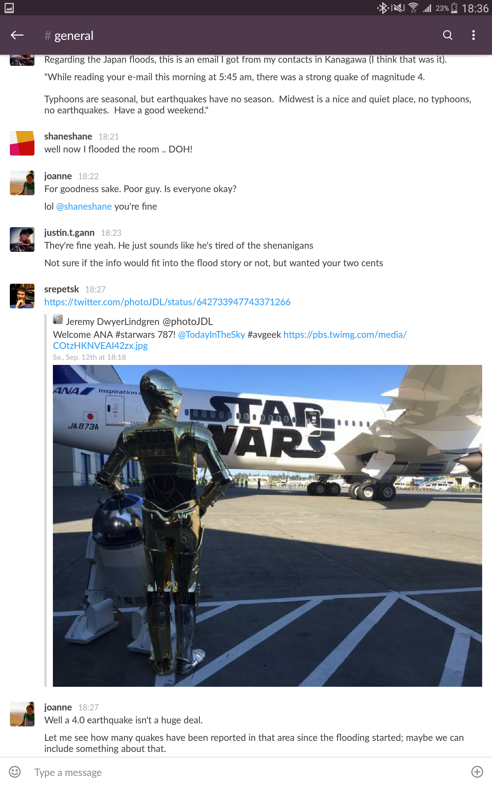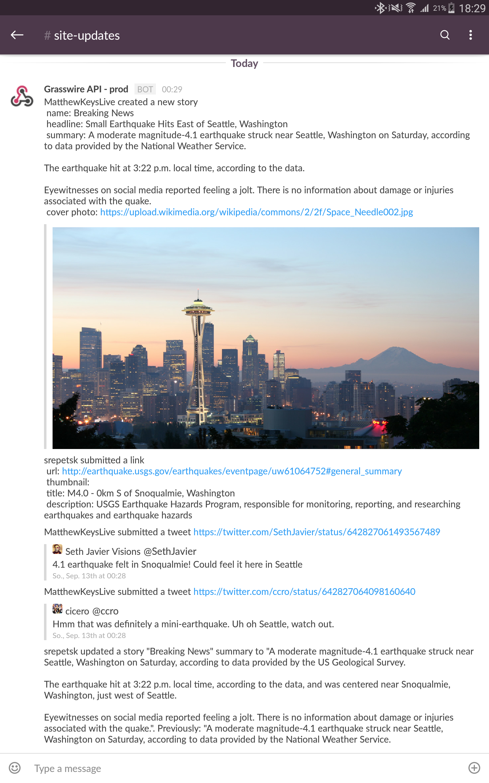 Tags darauf rumpelt wieder die Erde, doch dieses Mal in der Nähe Seattles. Anderer Ort, gleiche Stärke, 4.0. Und im Newsroom-Channel #site-updates erscheint automatisch die Nachricht über eine neue Story: „MatthewKeysLive created a new story. ‚Small Earthquake Hits East of Seattle, Washington‘.“