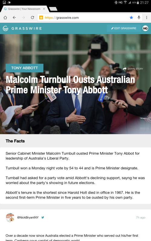 Nach einem produktiven Beitrag möchte ich den Reinigungseffekt nun einem Stresstest unterziehen. Ich erstelle mir extra einen neuen Twitter-Account unter Decknamen und überlege, wie ich Grasswire verfälschen kann. Um die Grasswire-Redakteure zu trollen ohne falsche Informationen zu verbreiten, entscheide ich mich, lediglich einen „Tippfehler“ in einem Artikel einzubauen. Im Artikel zum australischen Premierminister lösche ich ein „i“. Ich bin mir sicher, dass das automatische Seiten-Update mich sofort verraten, der Fehler unverzüglich verändert wird. Doch nichts dergleichen. Bei Redaktionsschluss dieses Artikels fand sich der Fehler noch immer auf Grasswire.