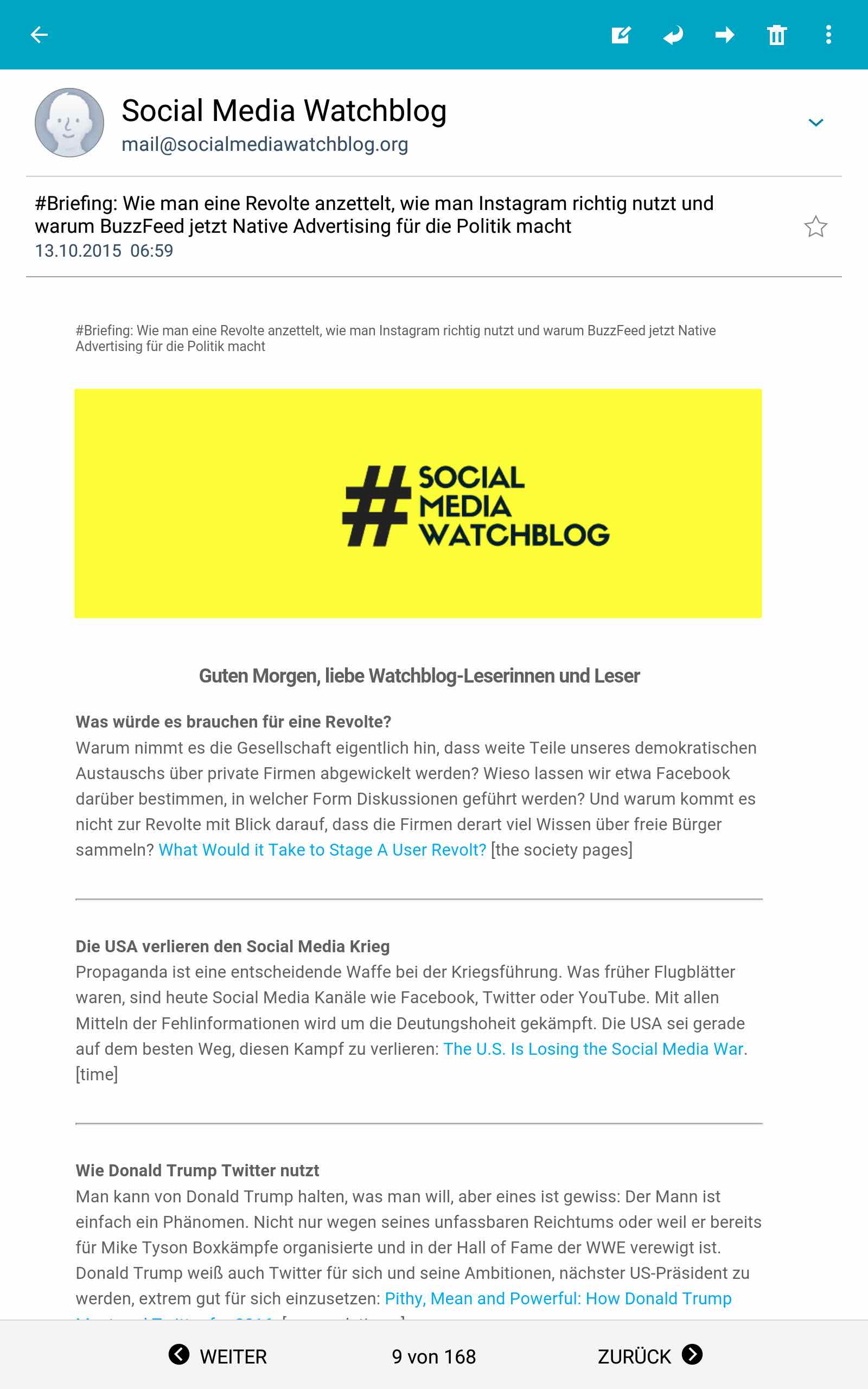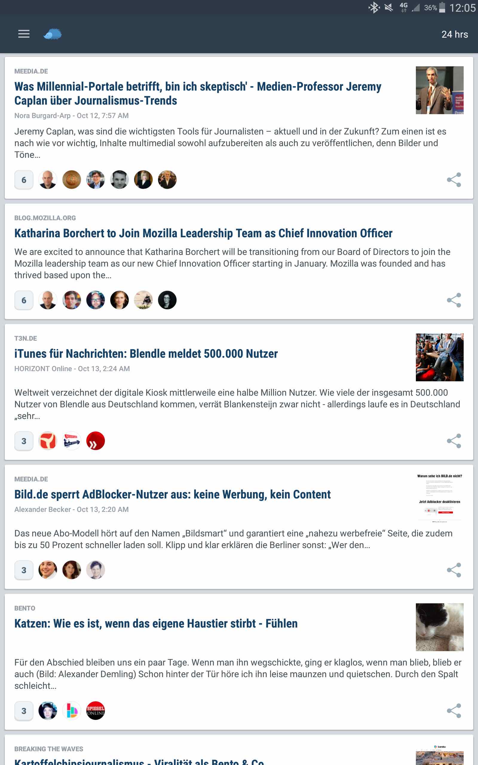 Gerade beim Social Media Watchblog muss ich ihm zustimmen. Das Angebot, das derzeit von einem sechsköpfigen Team betreut wird, liefert auch mir täglich kuratierte Beiträge zu Social Media. Derzeit hat der Newsletter nach eigenen Angaben rund zweitausend Abonnenten. Ich finde, dass er mehr verdient hat. Ich persönlich halte noch immer die Krautreporter-Morgenpost von Christian Fahrenbach für den besten Newsletter, insbesondere, weil er es immer wieder schafft, mich aus der Filterblase zu holen und mich dazu bringt, über meinen eigenen Horizont hinauszuschauen. Ebenfalls klasse ist die Blendle-Zeitungsübersicht und – nein, ich mache nicht mit bei all dem bento-Bashing – auch die News zum Wachwerden der bento-Redaktion bringen mir hin und wieder einen relevanten Lesetipp. Übrigens: Hier gibt es auch unseren Newsletter.