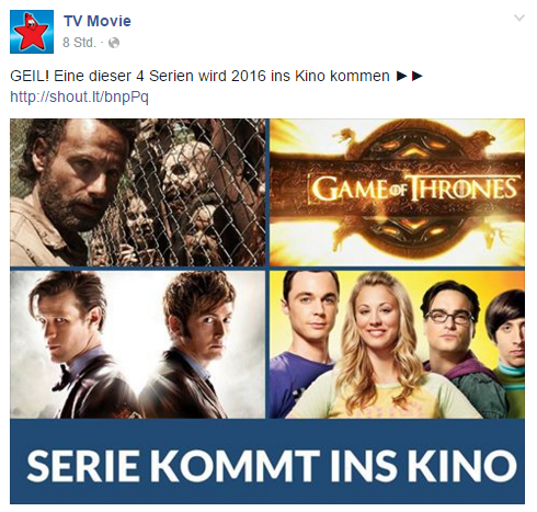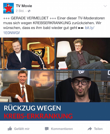 Neben den gezeigten, ganz spontanen Beispielen aus den Klatsch-Magazinen BUNTE und Gala, treibt auch das Fernsehmagazin TV Movie die eigene Klick- und Reichweiten-Geilheit bei Facebook auf die Spitze. Im Sommer nutzte die Social-Media-Redaktion der Zeitschrift die Krebserkrankung von Roger Willemsen für die eigenen Zwecke – und wurde dafür, absolut zurecht, medienkritisch zerrissen und vom Presserat gerügt: