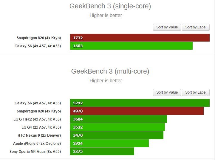 Kommen wir zum Snapdragon 820, der ja nun endlich wieder eine Eigenentwicklung ist. In unserer ausfuehrlichen Analyse hatten wir den Chip schon von allen Seiten beleuchtet und dabei bereits lobend die neuen Kryo-Kerne erwaehnt. Qualcomm besinnt sich hier wieder auf seine Staerken und uebernimmt keine Referenzdesigns mehr, was in meinen Augen beim 808 und 810 mit seiner big.LITTLE-Technologie eher in die Hose ging. Schaut man sich erste Benchmarks an, dann weiss man auch wieviel Dampf so ein einzelner Kyro-Kern hat… zumindest im Vergleich zu den aktuellen Spitzenreitern bei den Android Smartphones: