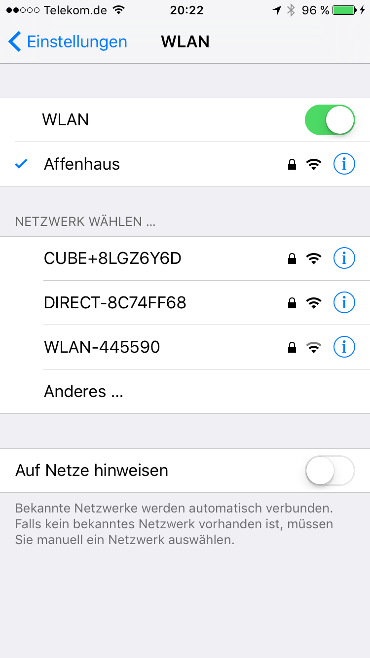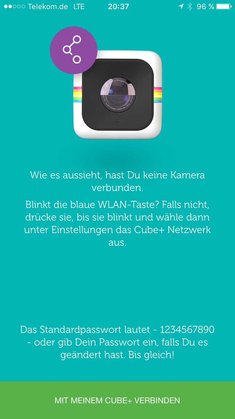 Die zugehörige App gibt es sowohl für Android als auch für iOS. Sie kann direkt im entsprechenden App-Store heruntergeladen werden. Nach dem Start werdet ihr aufgefordert, euch mit dem WiFi-Netzwerk des Cubes zu verbinden. Die entsprechenden Zugangsdaten findet ihr im Quickstart-Guide.