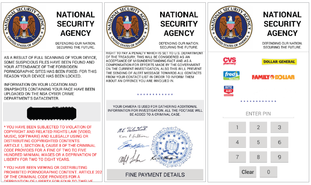 Als Ransomware wird ein Trojaner bezeichnet, der das Gerät oder darauf befindliche Daten sperrt und verschlüsselt und zur Freigabe eine Geldzahlung fordert. Teils wird etwa mit offiziell anmutenden „Nachrichten“ des FBI oder anderer Sicherheitsbehörden gedroht, die illegales Material auf dem Smartphone entdeckt hätten und die Vorwürfe gegen eine Zahlung fallen lassen würden.