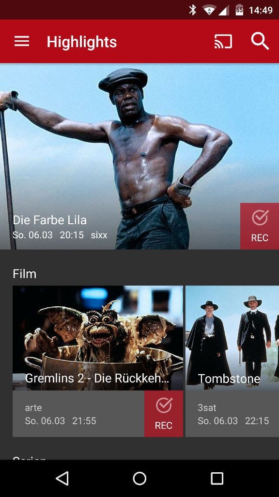 Wer nicht auf der Suche nach einer bestimmten Sendung ist, kann sich durch die Genres klicken. Hier hat man die Auswahl zwischen Filmen, Serien, Shows, Info/Doku, Sport und Musik. Diese unterteilen sich dann in jeweils logische Untergruppen, wie Action, Comedy, Thriller und so weiter. Desweiteren zeigt euch Save TV eine Auswahl an Highlights an, ebenfalls unterteilt nach den unterschiedlichen Genres.