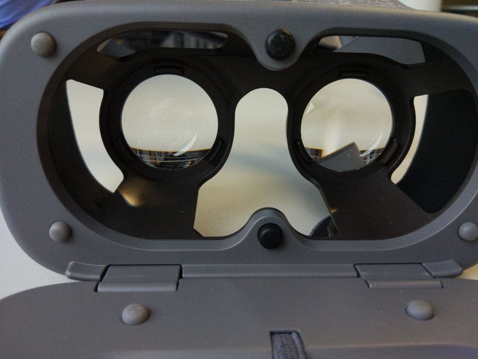Um in die Virtuelle Realität eintauchen zu können, wird das Smartphone erst einmal in die Brille eingespannt: Eine klappbare Front nimmt das Smartphone auf, durch ein festes Gummiband wird das Telefon dann eingespannt. Insgesamt zehn Gumminoppen verhindern das Herausrutschen.