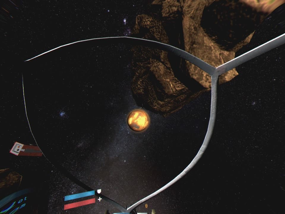 Damit sind wir leider einem Irrglauben erlegen. Space Rift klatscht uns so oft großen, graubraunen Farbmatsch vor die Augen, dass wir zusätzlich zum Schwindel auch noch Kopfschmerzen bekommen. Die werden übrigens auch von unangenehm langen Ladezeiten gefördert, in denen wir nichts als nackte Schwärze sehen. Mit VR-Brille und Headset auf dem Kopf ist schwarze Leere ohne Feedback, ob das Spiel hängt oder noch lädt, doch etwas beklemmend.
