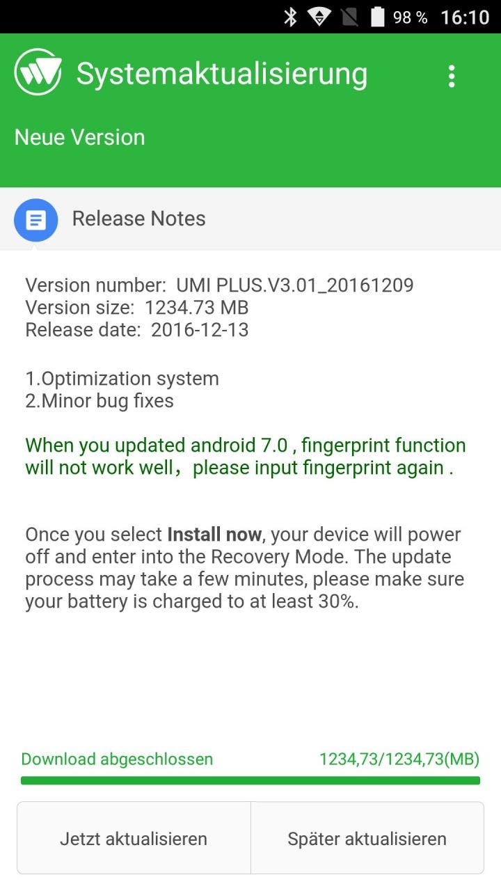 Das Umi Plus kommt mit nahezu unverändertem Android 6.0 Marshmallow daher, seit Januar sogar mit 7.0 Nougat, welches gerade per OTA-Update verteilt wird.