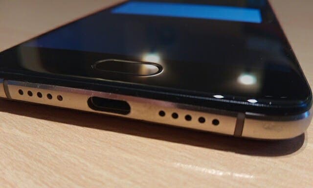 Auf der Unterseite befindet sich der USB-Type-C-Anschluss, sowie die Bohrungen für Lautsprecher und Mikrofon. Interessanterweise passen USB-C-Kabel von Drittherstellern nur sehr schlecht. Im Gegensatz zum mitgelieferten Kabel sitzen diese recht locker und lösen sich leicht. Das stört vor allem, wenn man das Umi Plus im Auto laden möchte: Bei Unebenheiten rutscht das Ladekabel gerne mal heraus. Dem kann man nur entgegenwirken, indem man das Umi Plus im Landscape-Modus befestigt.