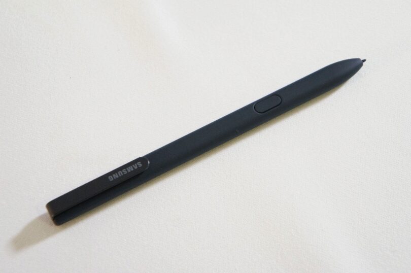 Liegt das Tablet vor einem im Hochformat auf dem Tisch, befinden sich auf der linken Seite die magnetischen Anschlüsse für die Tastatur. Diese wird am Rücken des Tab S3 befestigt und fungiert dann gleichzeitig wie ein Standbein für das Gerät, indem sie zweimal geknickt wird. Die magnetischen Füße des Tablets finden dabei in einer dafür vorgesehenen Kuhle auf der Tastatur Platz. Auf den Fotos sehen wir die niedliche Tastatur mit abgerundeten Tasten, die perfekt zu dem Tablet passt. Im Querformat aufgestellt befindet sich links an der Tastatur eine kleine Lasche für den neuen Pen. Dieser kommt mit Winkelerkennung für mehr Kontrolle auf dem Display und sieht mehr aus wie ein Kuli, als ein Stylus. Knöpfe, wie etwa beim Surface Pen, sind daran erstmal nicht erkennbar.