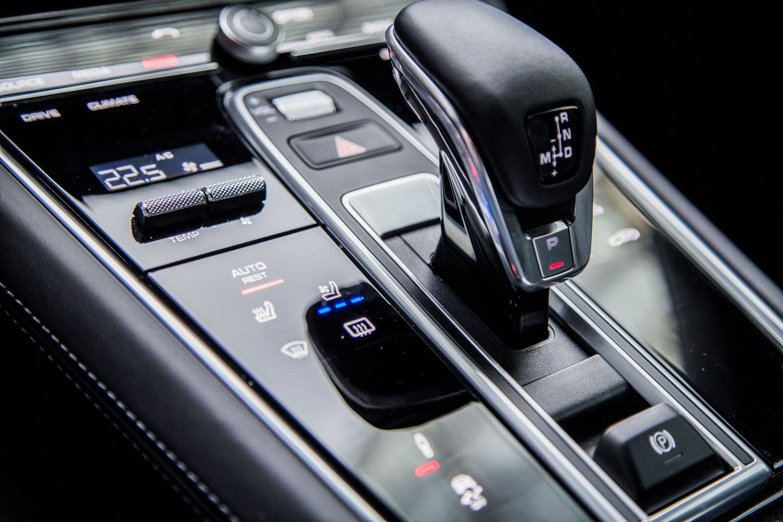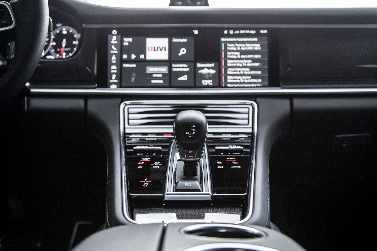 Der 12,3“-Touchscreen dominiert das Cockpit, ohne dabei wie ein Fremdkörper zu wirken. Generell fällt auf, dass Porsche in dem Panamera sehr stark auf Touch setzt. Denn fast alle Bedienelemente in der Mittelkonsole sind Teil einer großen Glasfläche. Bei der Auswahl einer Funktion bekommt ihr dank eines Vibrationsmotors auch ein haptisches Feedback.
