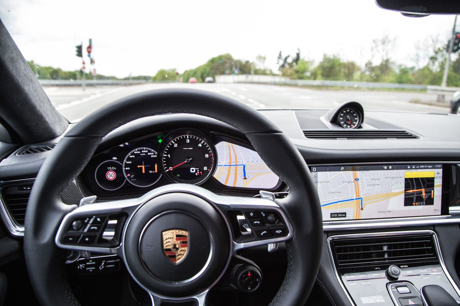 Wir haben die Gelegenheit gehabt, das neue Porsche Communication Management System (kurz: PCM) im neuen Panamera zu testen. Neben dem 12,3‘‘ großen Hauptdisplay stehen dem Fahrer auch noch zwei weitere Displays neben dem analogen Drehzahlmesser im Cockpit zur Verfügung.