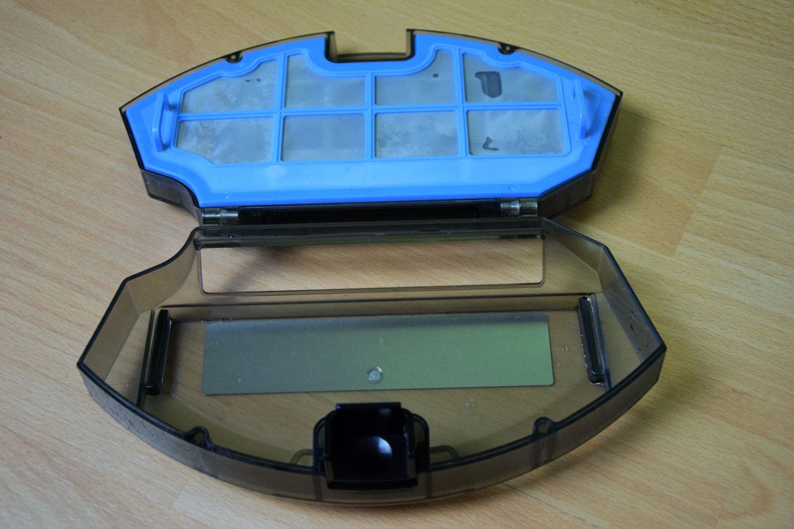 Der zweite Filter ist auf dem Bild als schwarzer Stoff zu erkennen, der die Luft von feinen Partikelchen säubern soll. Die dritte Stufe ist ein HEPA-Filter, der auch kleinste Feinstaub-Teilchen aufhält. Somit soll der RoboVac auch besonders gut für Allergiker oder Asthmatiker geeignet sein. Das Leeren des Auffangbehälters ist eigentlich sehr einfach, denn er wird einfach aufgeklappt und kurz geschüttelt. Macht man dies in einem Müllbeutel, kann eigentlich nichts daneben gehen, wenn man vorsichtig ist.